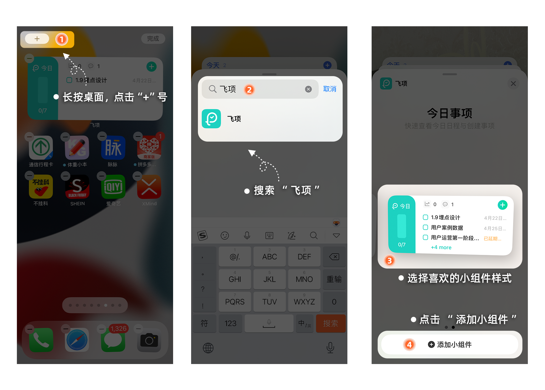 苹果用户:长按桌面-左上角“+”号-选择飞项小组件-小组件添加完成