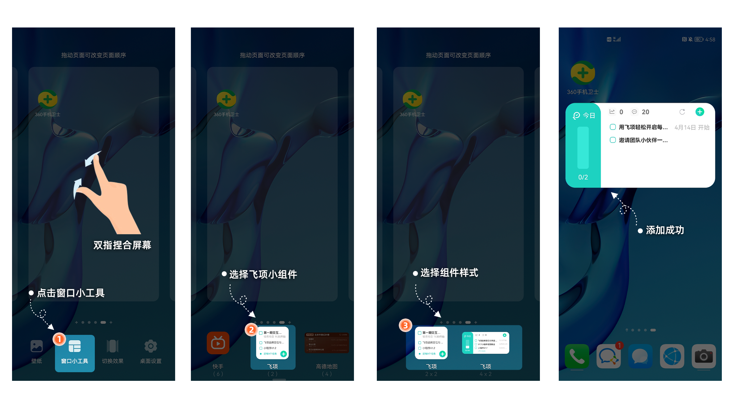 安卓用户:长按/双指捏合桌面-“窗口小工具”-选择飞项小组件-小组件添加完成