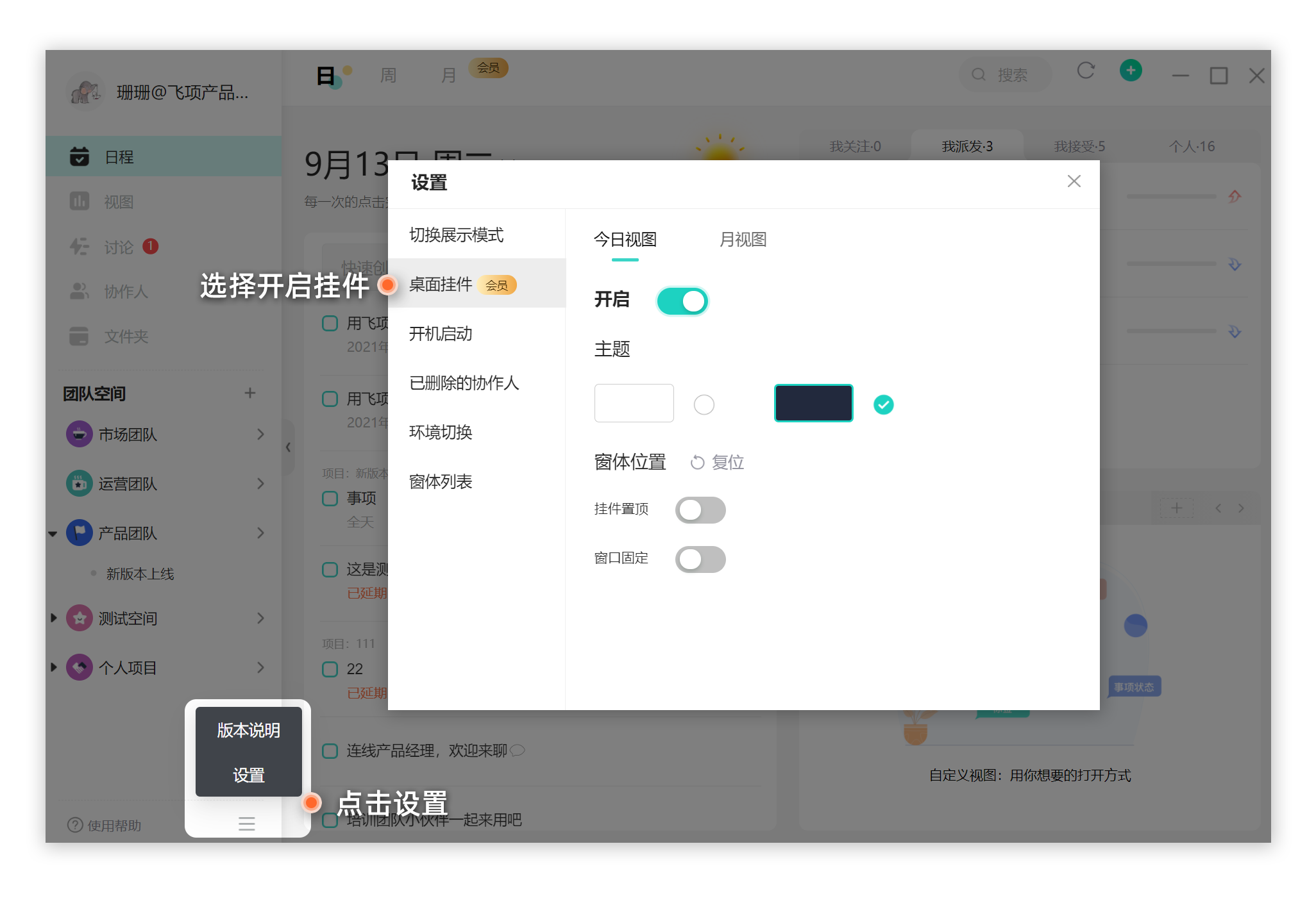 电脑端:点击左下角更多-点击设置-开启桌面挂件
