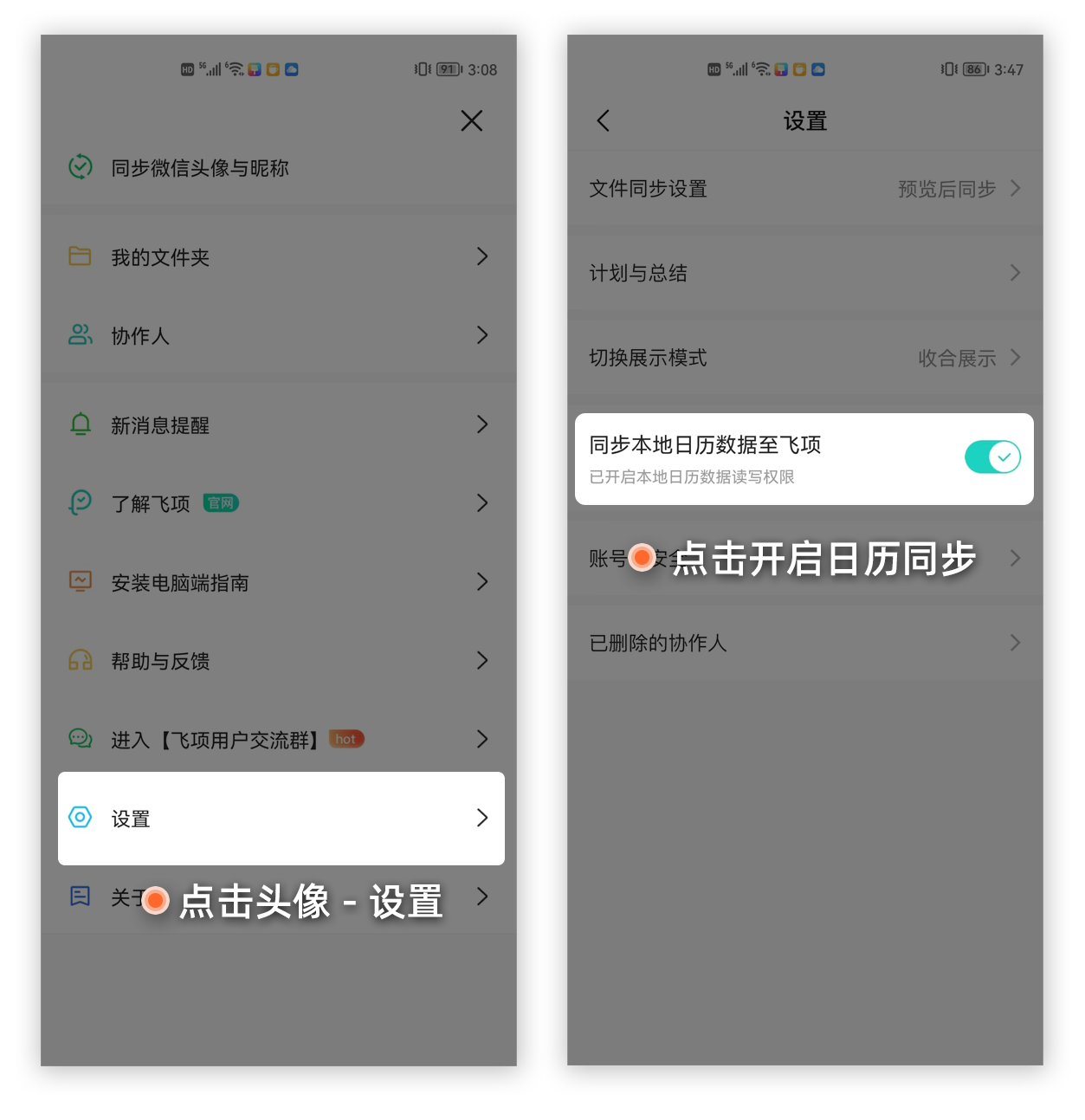日历同步:可将手机里的日历任务同步到飞项,进行统一的查看和管理。