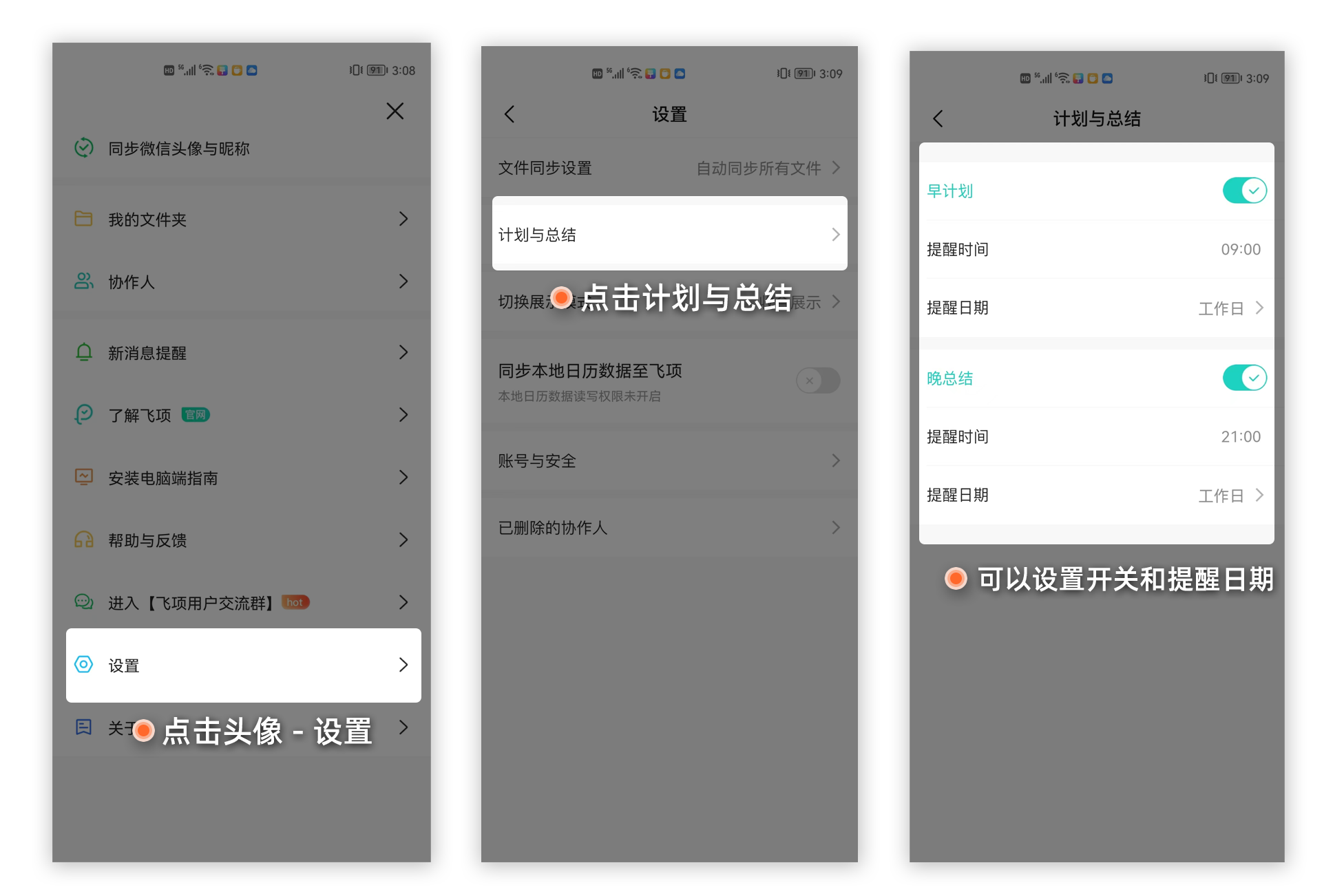 详细操作:点击“头像”,点击“设置”,找到“计划与总结”,可选择开启或关闭【计划与总结】、更改提醒日期