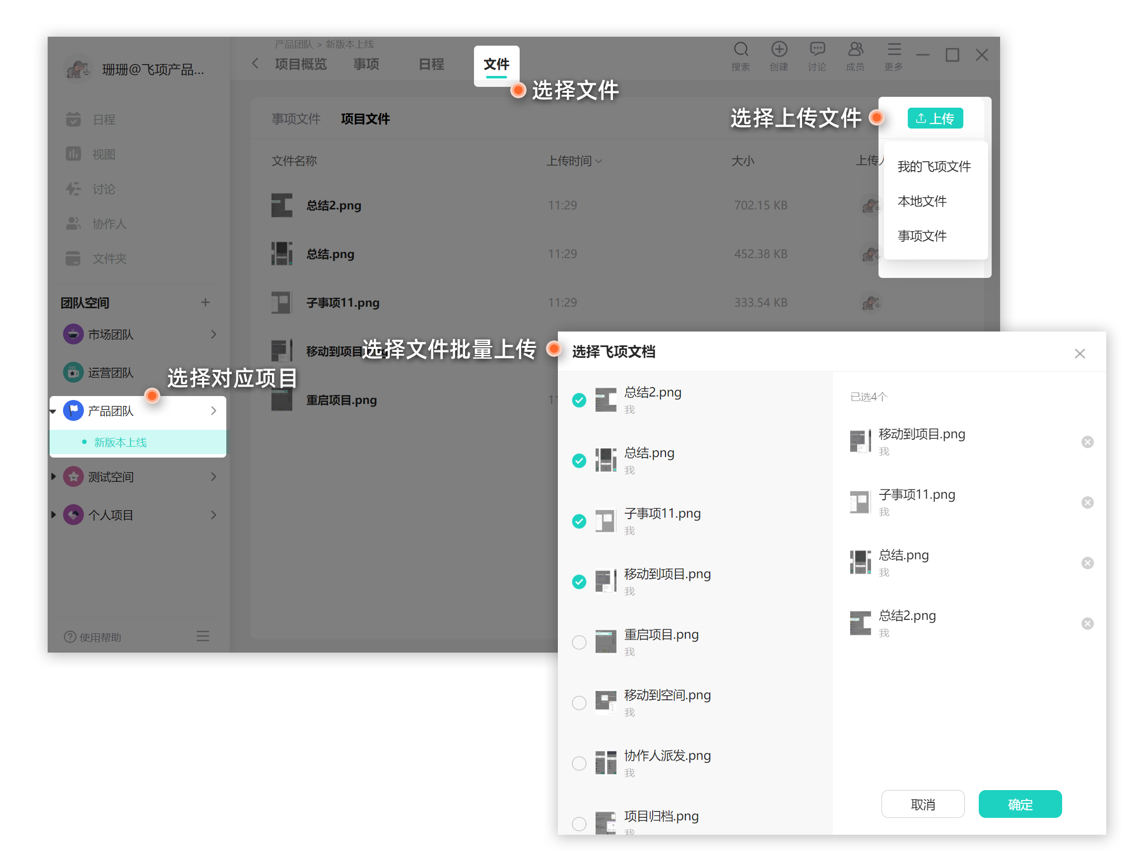 在项目文件中,飞项会将项目背景文件、项目内事项的过程文件(含讨论内文件、背景文件)分栏保存,并支持上传、批量下载、重命名等多种操作。