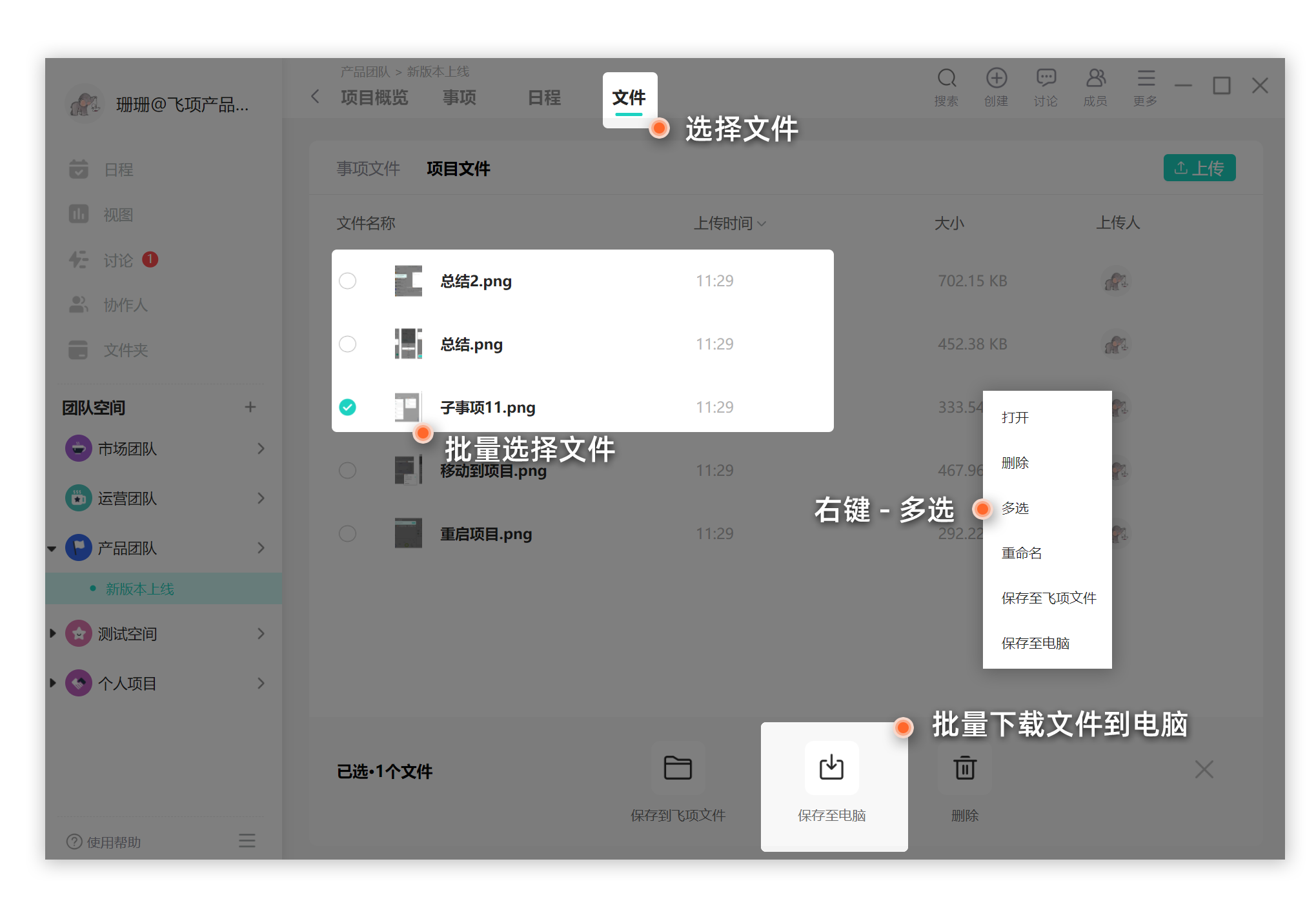 详细操作:选择“项目”板块,点击“文件”,右键选择单个要下载的文件,选择【多选】,批量选择要下载的文件,选择完毕即可点击下方的“保存至电脑”。