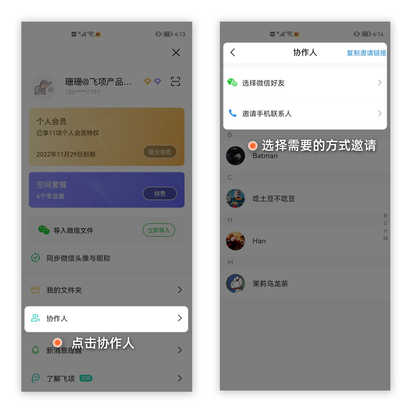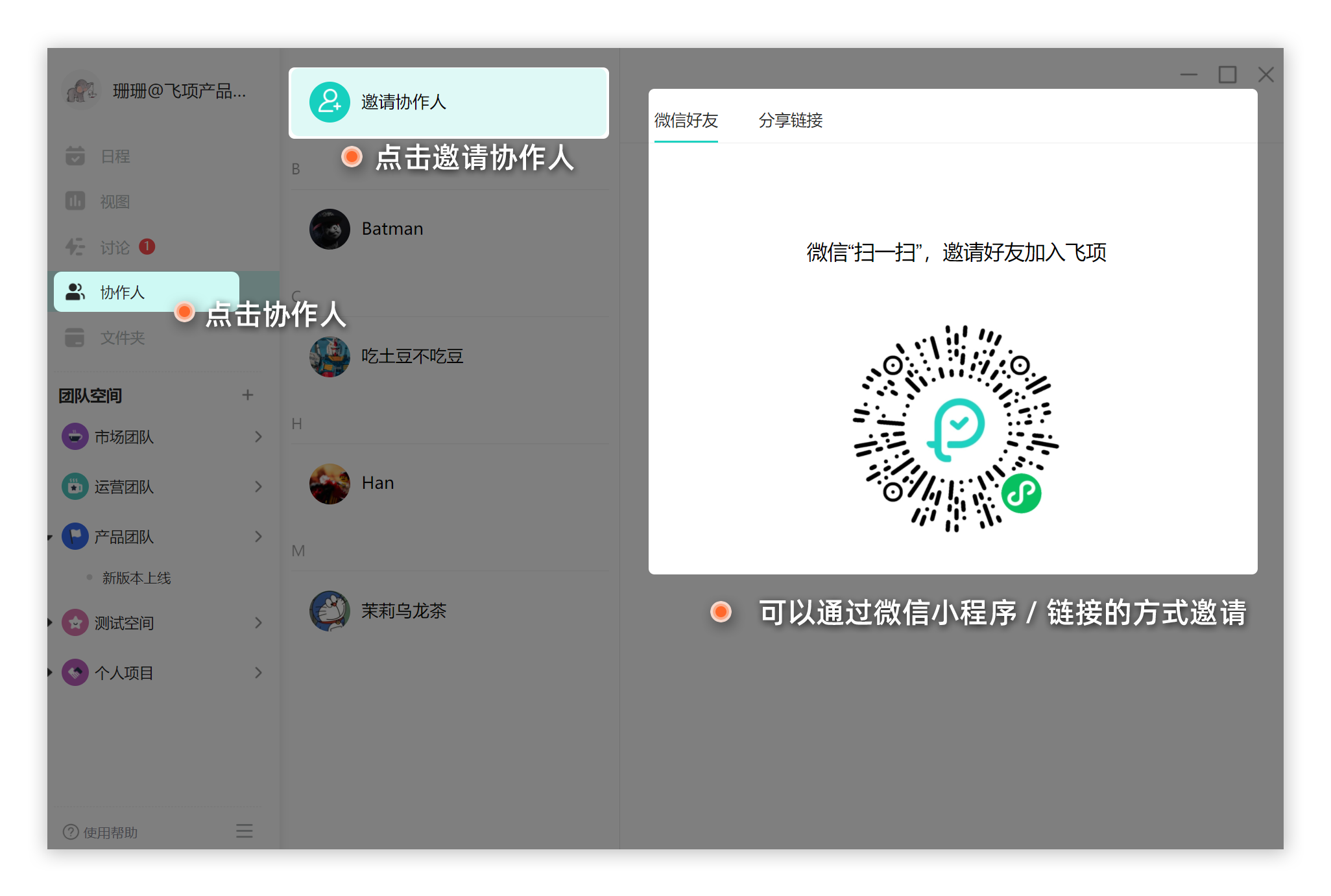协您可以通过扫码发送微信邀请卡片,邀请对方成为协作人,您也可以复制邀请链接发送给对方成为您的协作人。