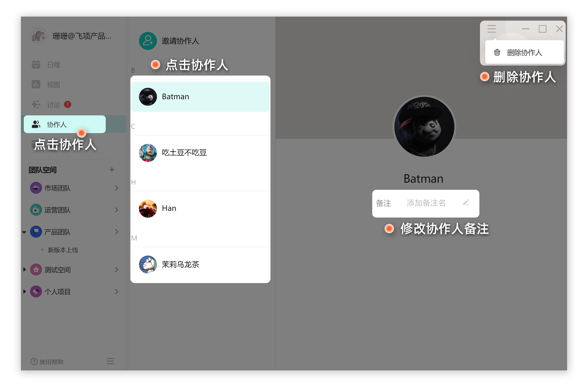 成为协作人后,可以协作人板块修改协作人的名称,也可以点击右上角删除协作人